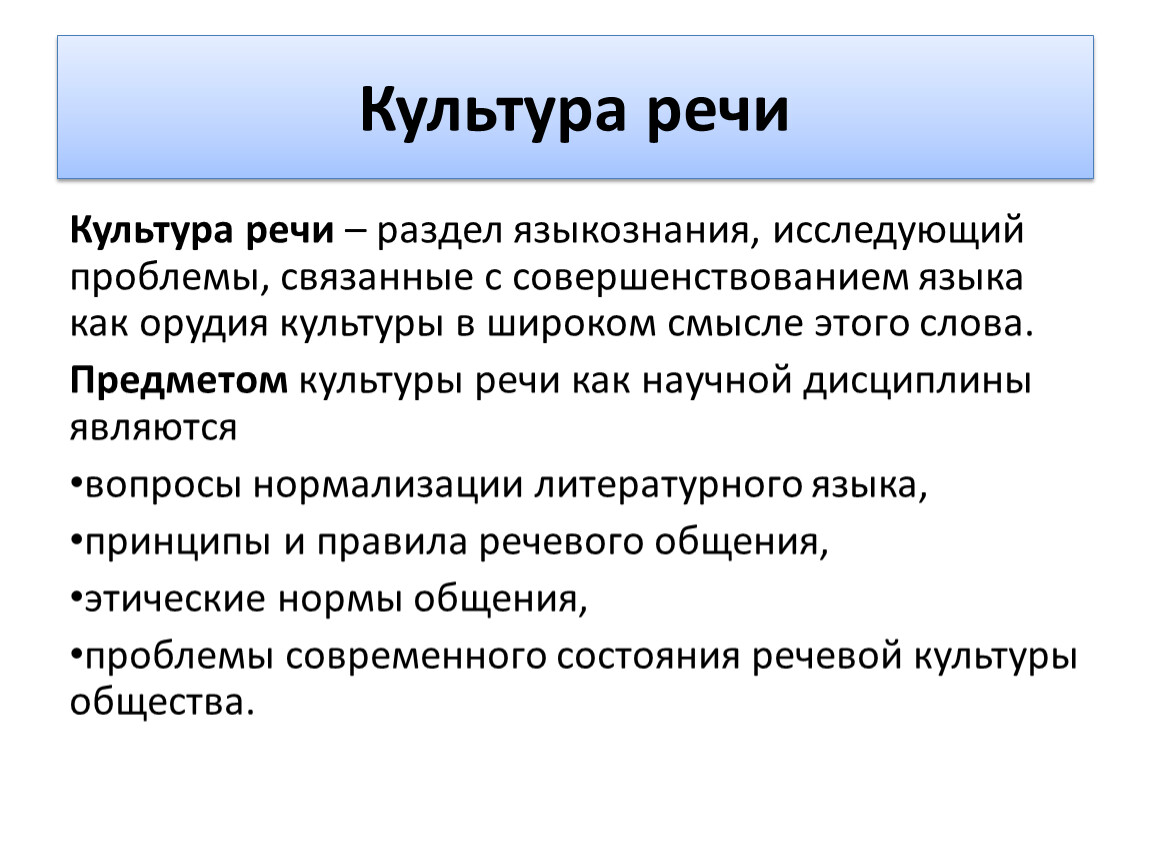 Культура речи – раздел языкознания, исследующий проблемы, связанные с совершенствованием языка как орудия культуры в широком смысле этого слова.