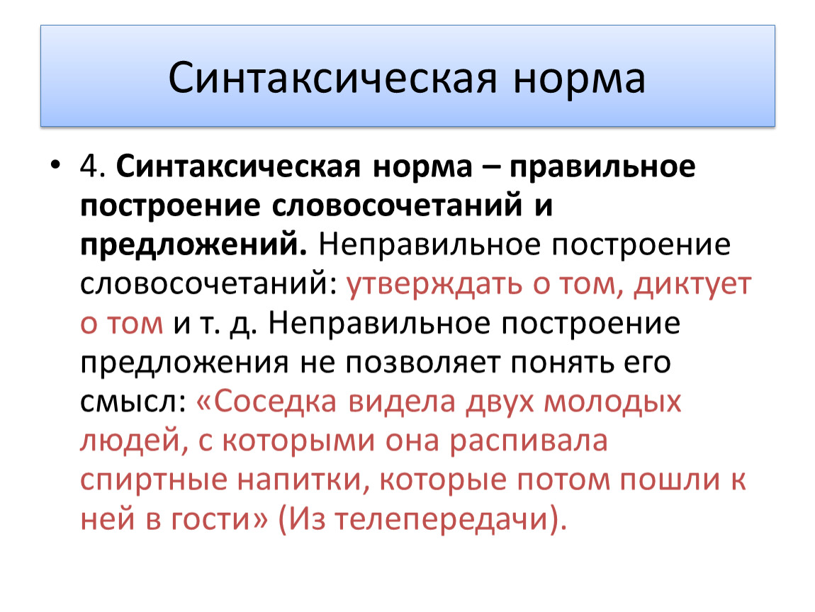 4. Синтаксическая норма – правильное построение словосочетаний и предложений. Неправильное построение словосочетаний: утверждать о том, диктует о том и т. д. Неправильное построение предложения не позволяет понять его смысл: «Соседка видела двух молодых людей, с которыми она распивала спиртные напитки, которые потом пошли к ней в гости» (Из телепередачи).