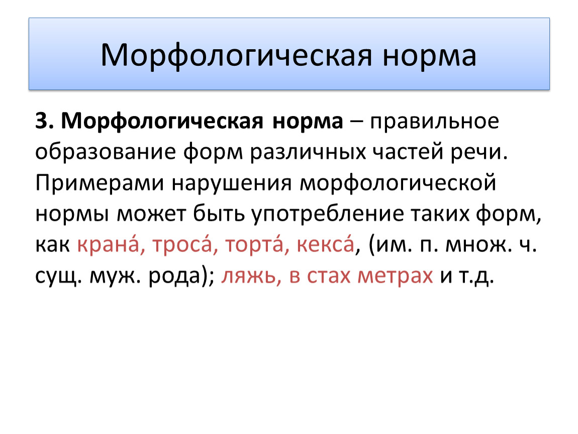 3. Морфологическая норма – правильное образование форм различных частей речи. Примерами нарушения морфологической нормы может быть употребление таких форм, как крана̒, троса̒, торта̒, кекса̒, (им. п. множ. ч. сущ. муж. рода); ляжь, в стах метрах и т.д.