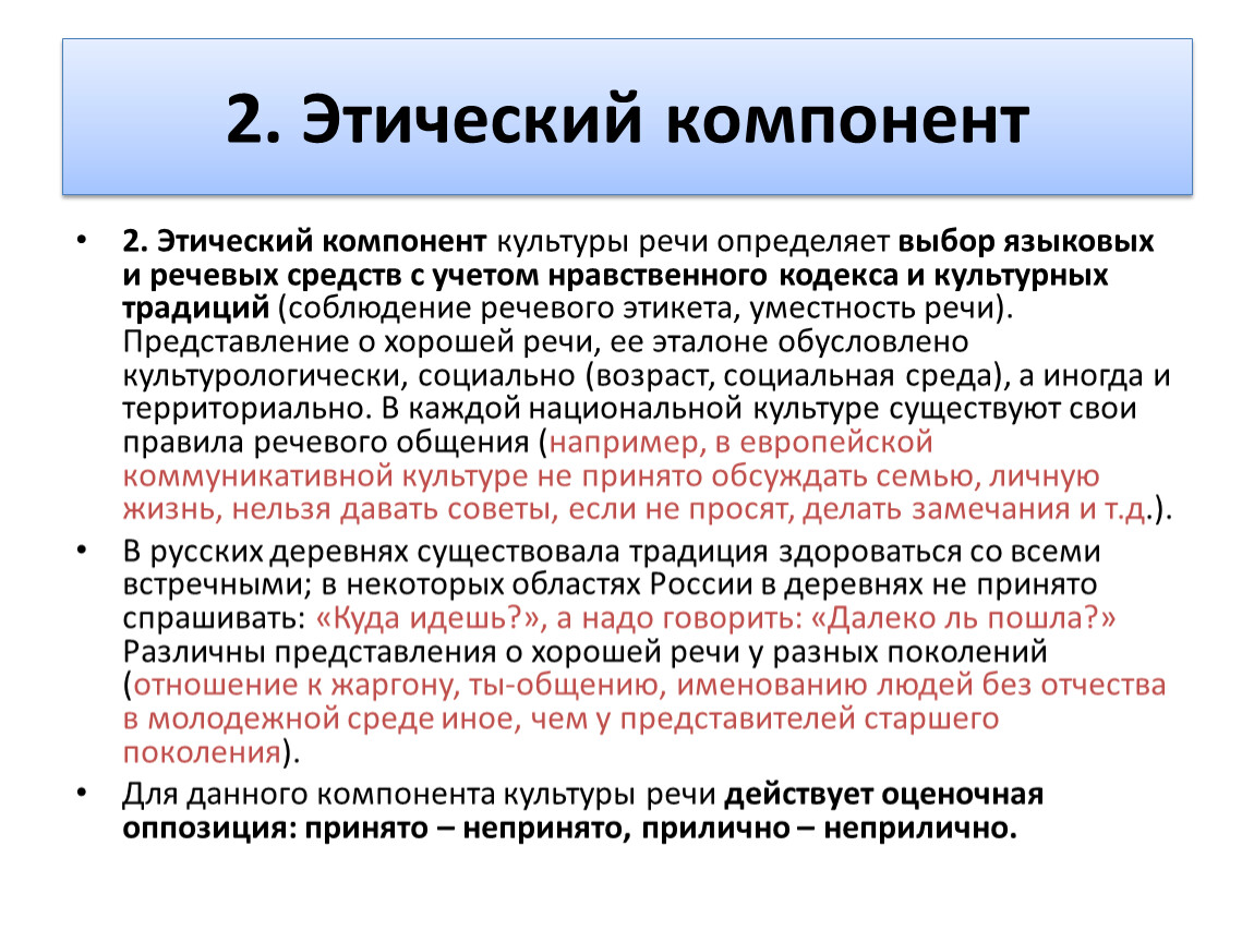 2. Этический компонент культуры речи определяет выбор языковых и речевых средств с учетом нравственного кодекса и культурных традиций (соблюдение речевого этикета, уместность речи). Представление о хорошей речи, ее эталоне обусловлено культурологически, социально (возраст, социальная среда), а иногда и территориально. В каждой национальной культуре существуют свои правила речевого общения (например, в европейской коммуникативной культуре не принято обсуждать семью, личную жизнь, нельзя давать советы, если не просят, делать замечания и т.д.).