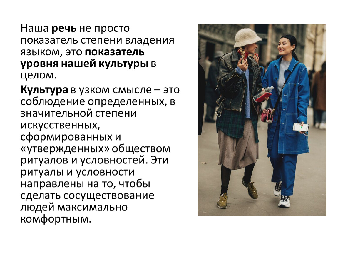 Культура в узком смысле – это соблюдение определенных, в значительной степени искусственных, сформированных и «утвержденных» обществом ритуалов и условностей. Эти ритуалы и условности направлены на то, чтобы сделать сосуществование людей максимально комфортным.