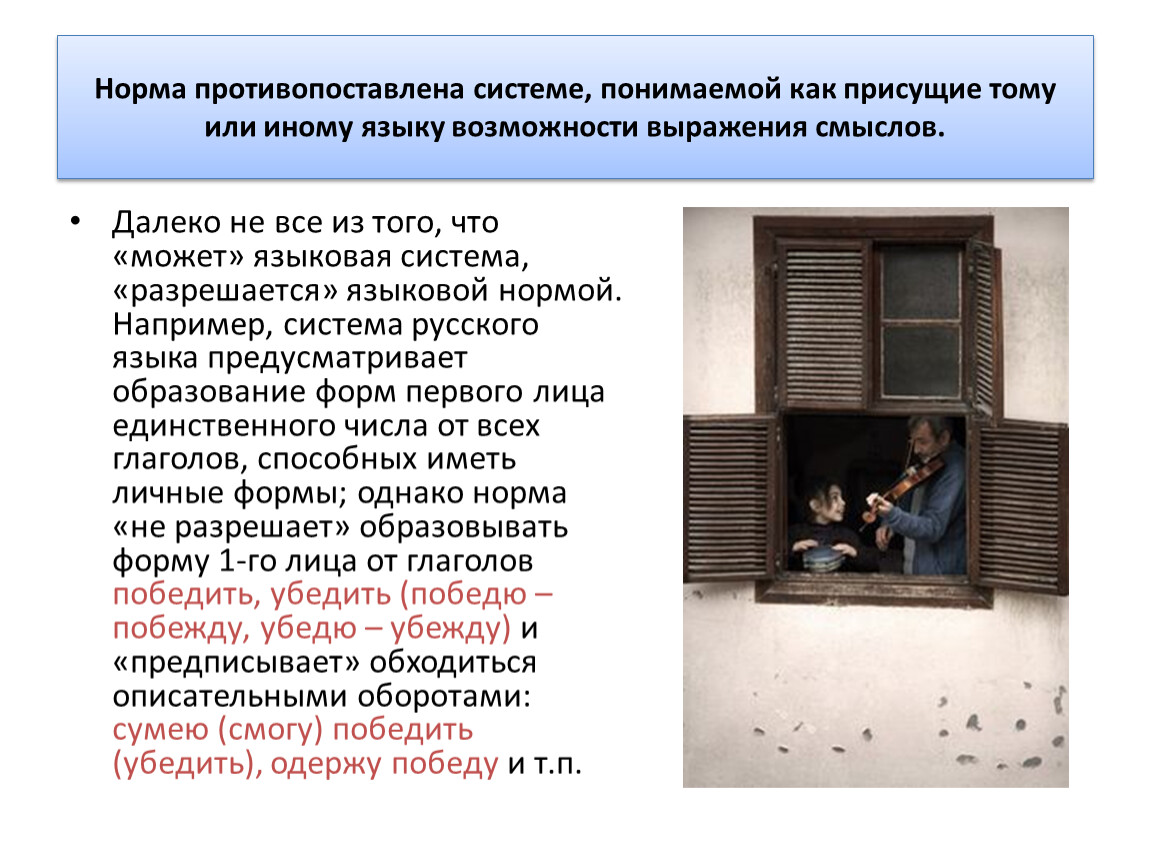 Далеко не все из того, что «может» языковая система, «разрешается» языковой нормой. Например, система русского языка предусматривает образование форм первого лица единственного числа от всех глаголов, способных иметь личные формы; однако норма «не разрешает» образовывать форму 1-го лица от глаголов победить, убедить (победю – побежду, убедю – убежду) и «предписывает» обходиться описательными оборотами: сумею (смогу) победить (убедить), одержу победу и т.п.