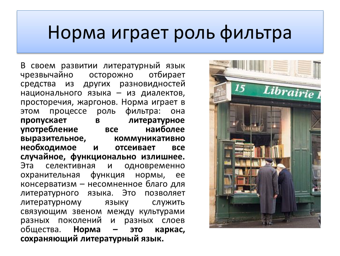 В своем развитии литературный язык чрезвычайно осторожно отбирает средства из других разновидностей национального языка – из диалектов, просторечия, жаргонов. Норма играет в этом процессе роль фильтра: она пропускает в литературное употребление все наиболее выразительное, коммуникативно необходимое и отсеивает все случайное, функционально излишнее. Эта селективная и одновременно охранительная функция нормы, ее консерватизм – несомненное благо для литературного языка. Это позволяет литературному языку служить связующим звеном между культурами разных поколений и разных слоев общества. Норма – это каркас, сохраняющий литературный язык.