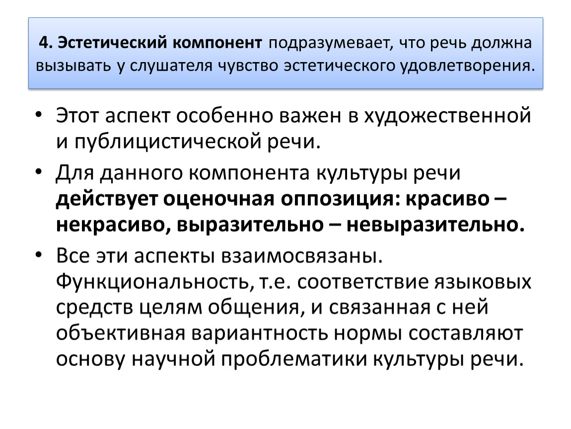 4. Эстетический компонент подразумевает, что речь должна вызывать у слушателя чувство эстетического удовлетворения.