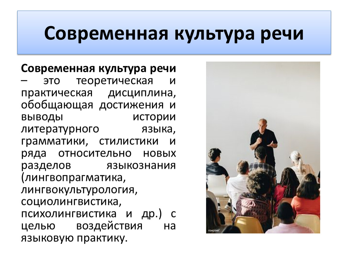 Современная культура речи – это теоретическая и практическая дисциплина, обобщающая достижения и выводы истории литературного языка, грамматики, стилистики и ряда относительно новых разделов языкознания (лингвопрагматика, лингвокультурология, социолингвистика, психолингвистика и др.) с целью воздействия на языковую практику.