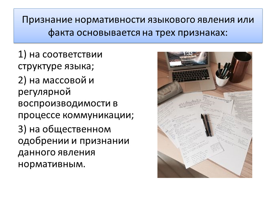 Признание нормативности языкового явления или факта основывается на трех признаках:
