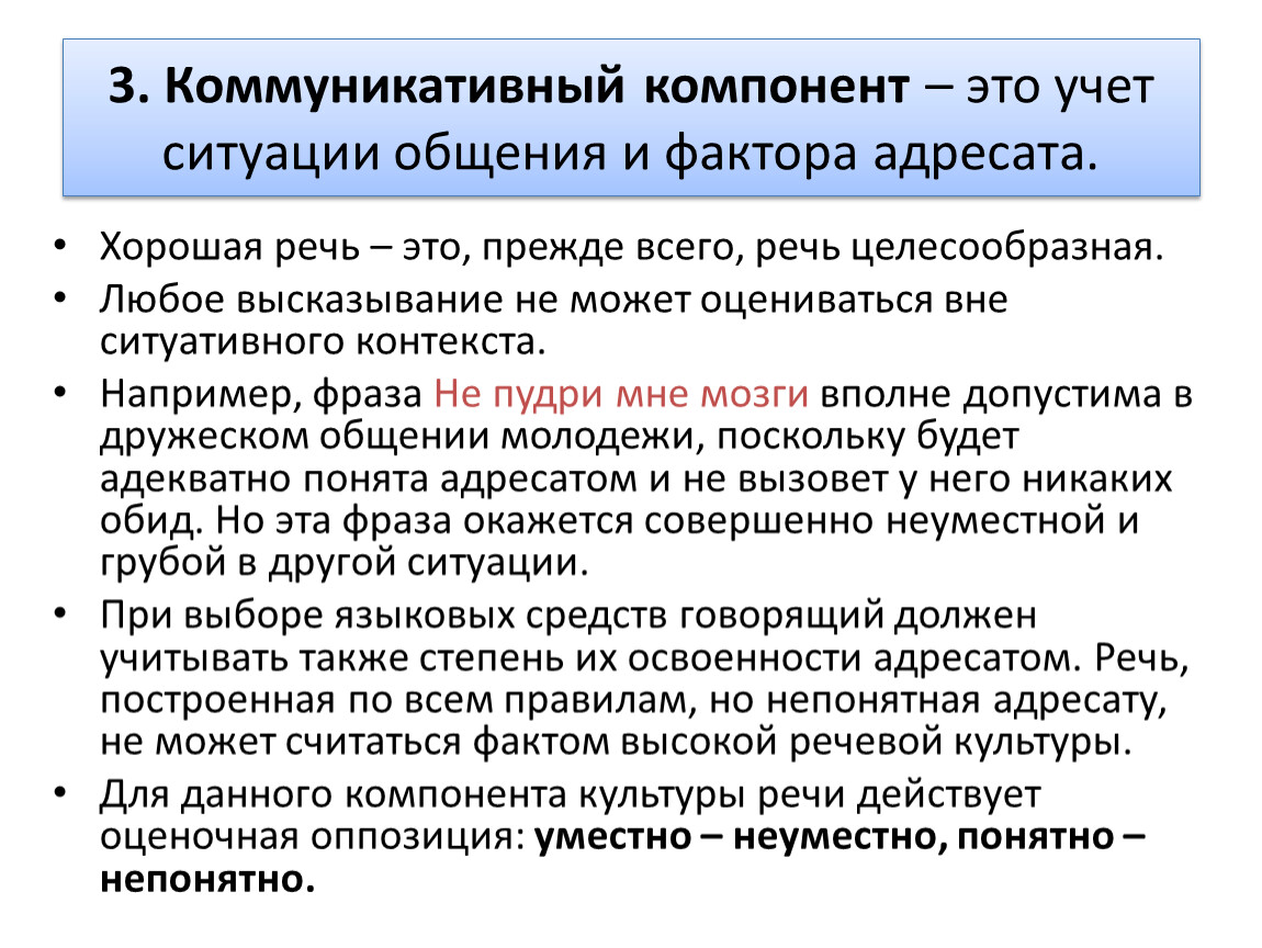 3. Коммуникативный компонент – это учет ситуации общения и фактора адресата.