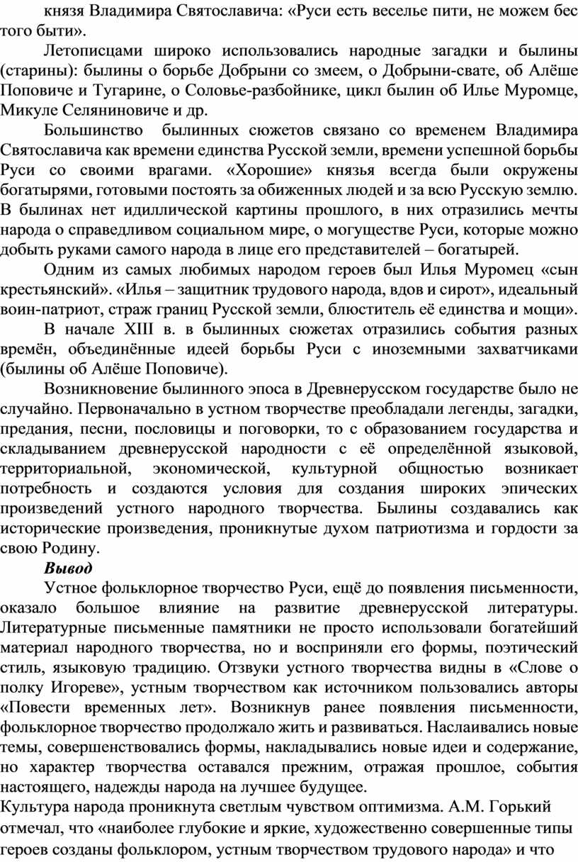 Аннотация. Статья посвящена историческим очеркам развития культуры Руси IX – первой половины XII веков. Очерк-размышление об устном народном творчестве древнерусского государства, где фольклор занимает важную историческую нишу.