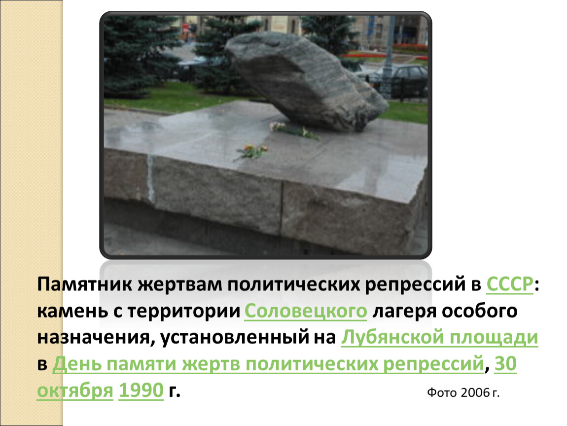 Памятник жертвам политических репрессий в СССР: камень с территории Соловецкого лагеря особого назначения, установленный на Лубянской площади в День памяти жертв политических репрессий, 30 октября 1990 г. Фото 2006 г.