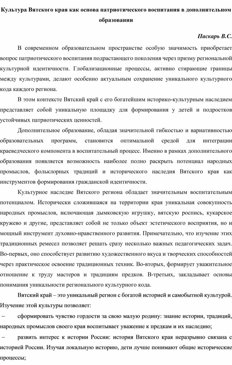 Таким образом, систематическое и целенаправленное включение элементов культурного наследия Вятского края в программы дополнительного образования создает прочную основу для формирования у подрастающего поколения устойчивых патриотических чувств, глубокого уважения к истории и традициям родного края, а также осознанной гражданской позиции. Комплексный подход, сочетающий теоретическое изучение культурного наследия с практическим освоением традиционных ремесел и участием в краеведческих проектах, позволяет наиболее эффективно реализовывать задачи патриотического воспитания в современной образовательной среде.