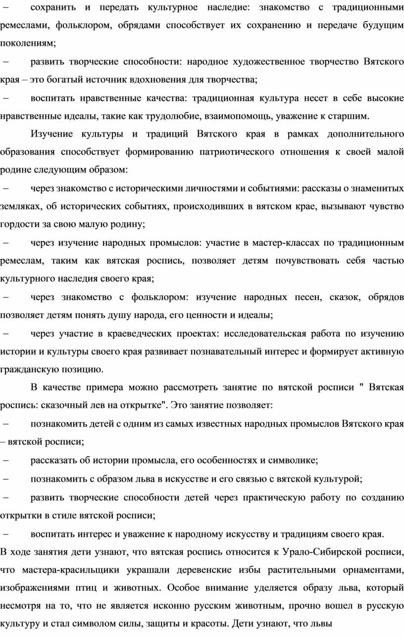 В качестве примера можно рассмотреть занятие по вятской росписи " Вятская роспись: сказочный лев на открытке". Это занятие позволяет: