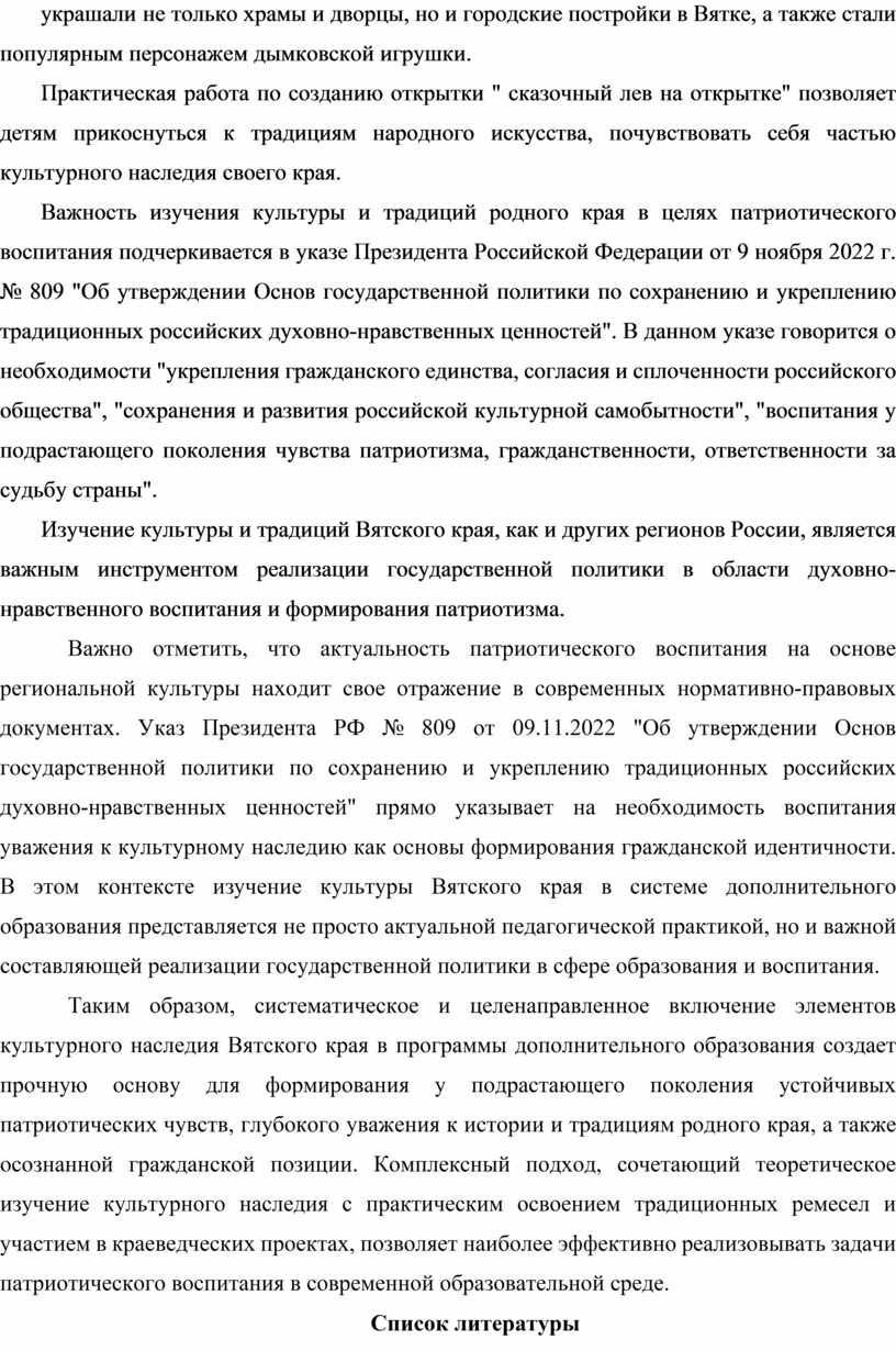 Важно отметить, что актуальность патриотического воспитания на основе региональной культуры находит свое отражение в современных нормативно-правовых документах. Указ Президента РФ № 809 от 09.11.2022 "Об утверждении Основ государственной политики по сохранению и укреплению традиционных российских духовно-нравственных ценностей" прямо указывает на необходимость воспитания уважения к культурному наследию как основы формирования гражданской идентичности. В этом контексте изучение культуры Вятского края в системе дополнительного образования представляется не просто актуальной педагогической практикой, но и важной составляющей реализации государственной политики в сфере образования и воспитания.
