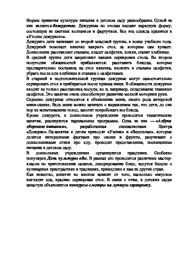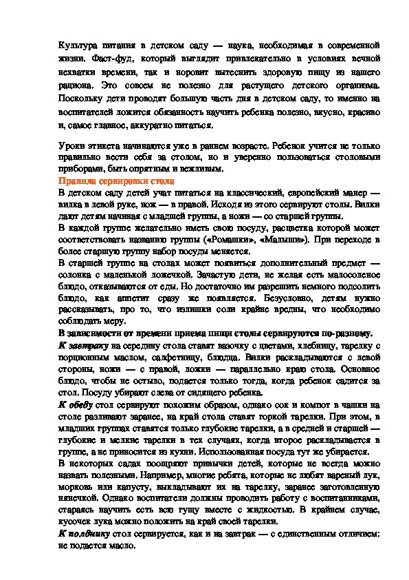 Культура питания в детском саду — наука, необходимая в современной жизни. Фаст-фуд, который выглядит привлекательно в условиях вечной нехватки времени, так и норовит вытеснить здоровую пищу из нашего рациона. Это совсем не полезно для растущего детского организма. Поскольку дети проводят большую часть дня в детском саду, то именно на воспитателей ложится обязанность научить ребенка полезно, вкусно, красиво и, самое главное, аккуратно питаться.