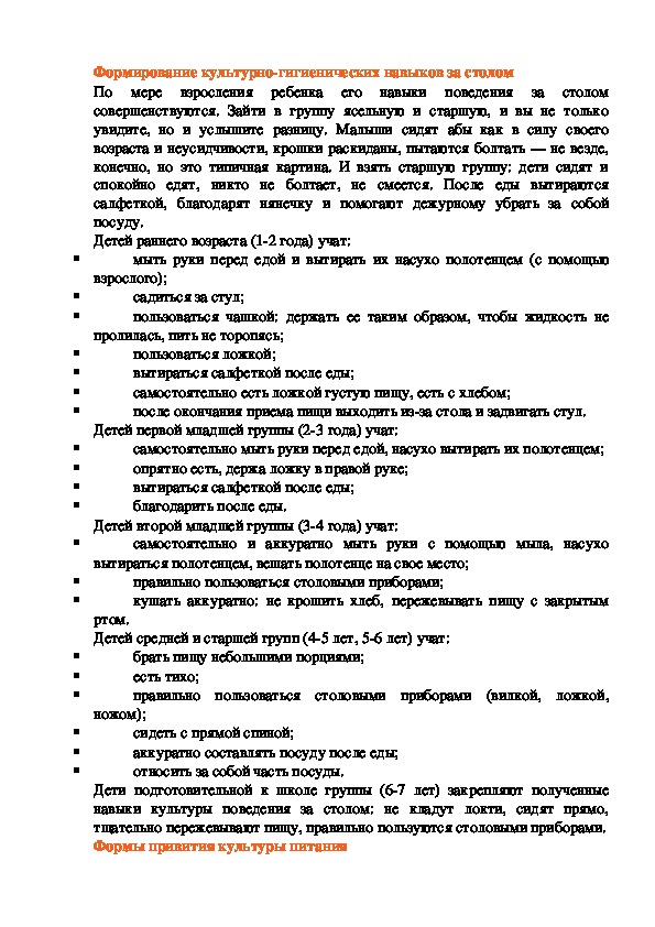 Формы привития культуры питания в детском саду разнообразны. Одной из