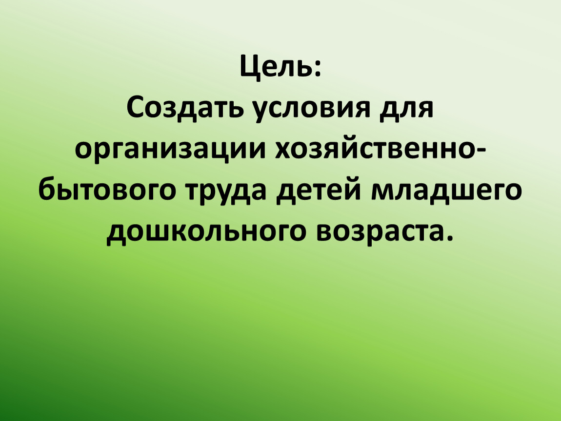 Цель: Создать условия для организации хозяйственно-бытового труда детей младшего дошкольного возраста.