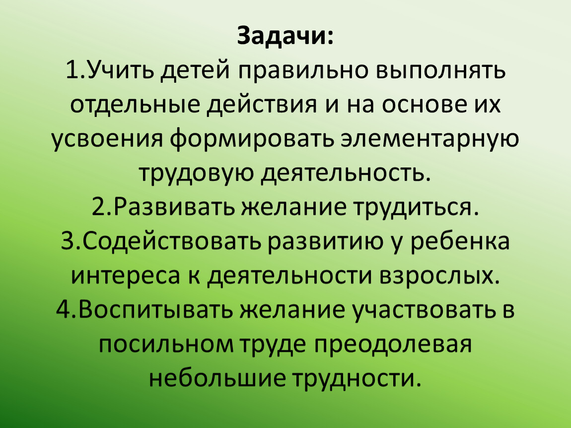 Задачи:1.Учить детей правильно выполнять отдельные действия и на основе их усвоения формировать элементарную трудовую деятельность.2.Развивать желание трудиться.3.Содействовать развитию у ребенка интереса к деятельности взрослых.4.Воспитывать желание участвовать в посильном труде преодолевая небольшие трудности.