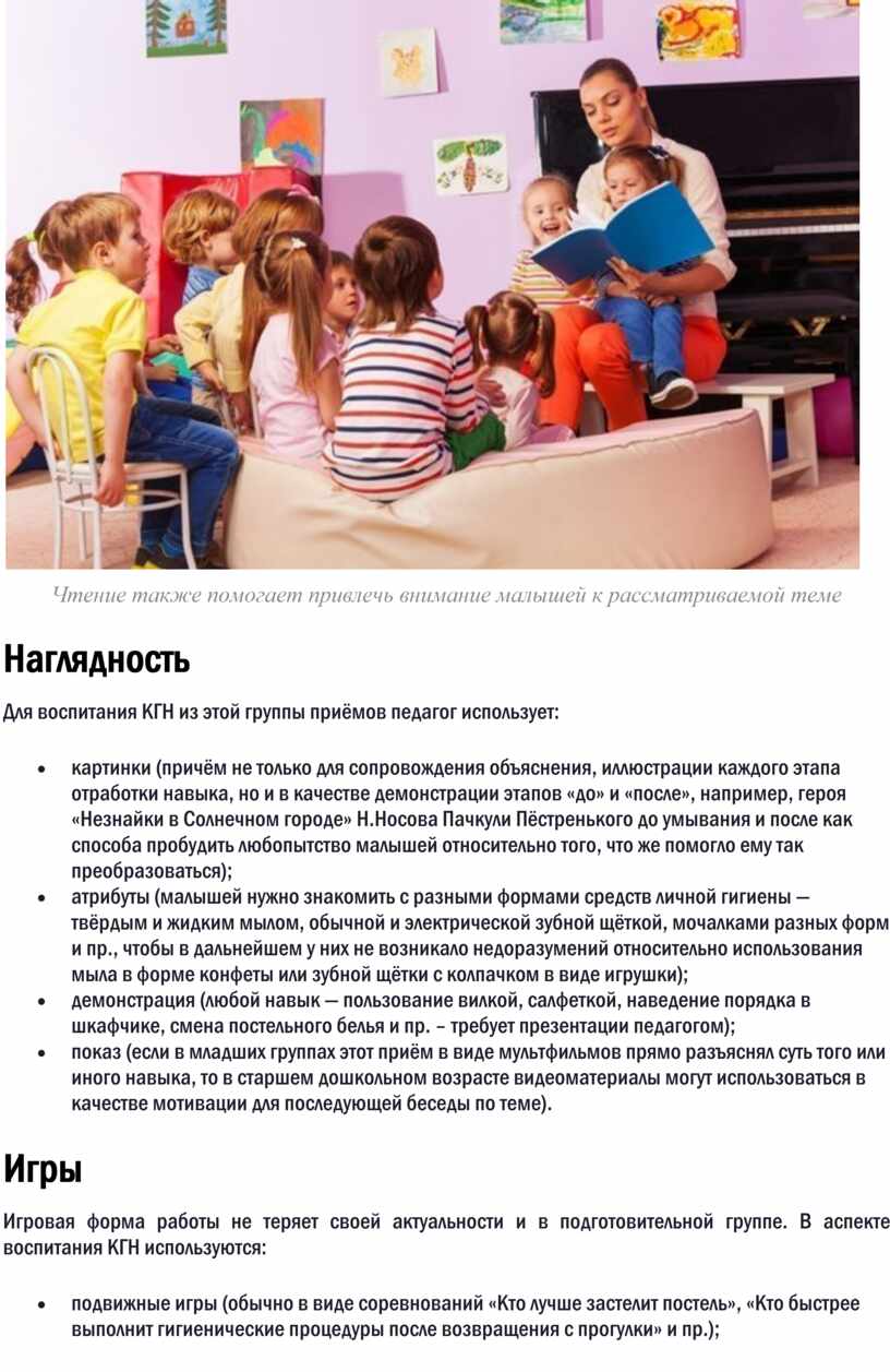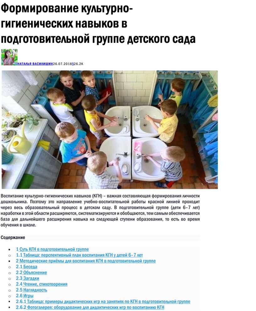 Воспитание культурно-гигиенических навыков (КГН) – важная составляющая формирования личности дошкольника. Поэтому это направление учебно-воспитательной работы красной линией проходит через весь образовательный процесс в детском саду. В подготовительной группе (дети 6–7 лет) наработки в этой области расширяются, систематизируются и обобщаются, тем самым обеспечивается база для дальнейшего расширения навыка на следующей ступени образования, то есть во время обучения в школе.