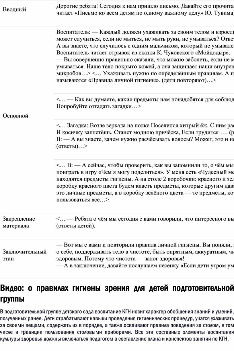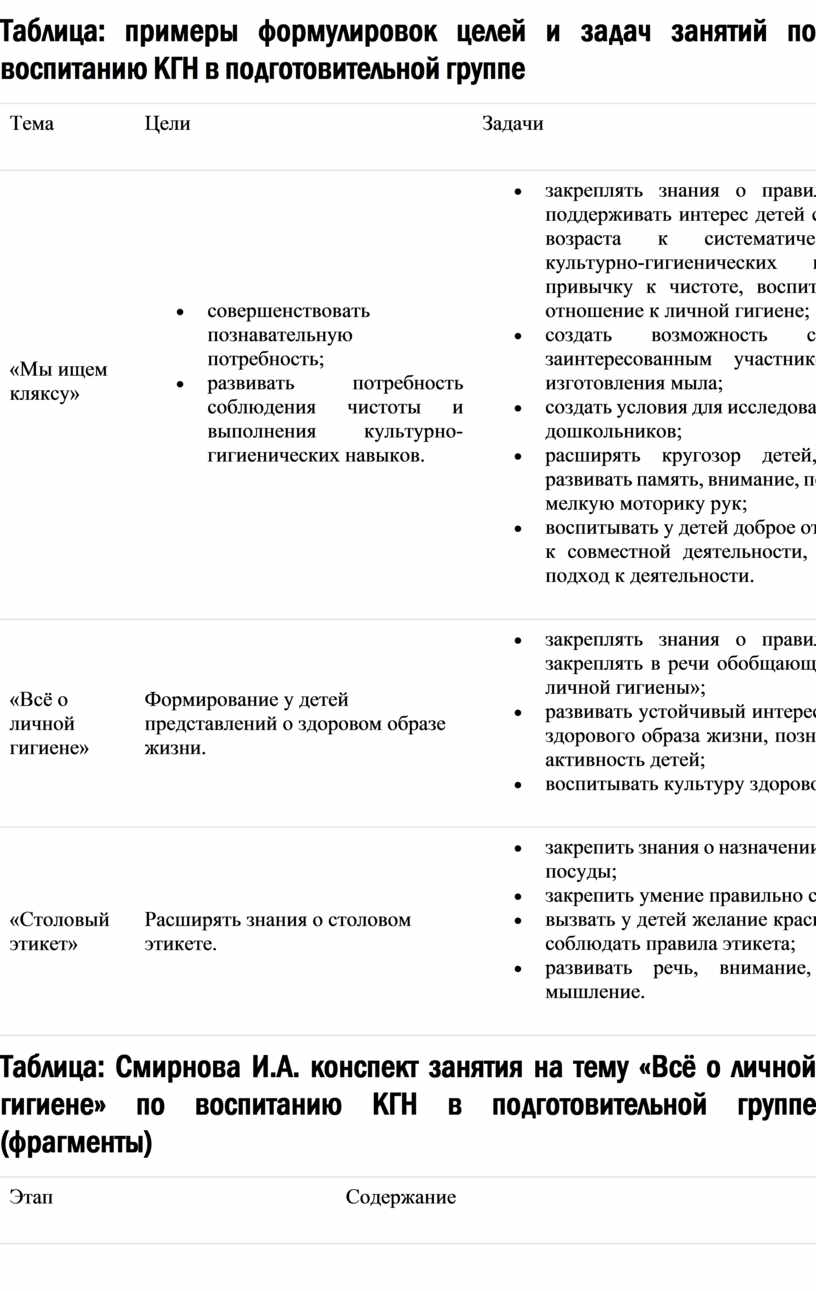 Таблица: Смирнова И.А. конспект занятия на тему «Всё о личной гигиене» по воспитанию КГН в подготовительной группе (фрагменты)