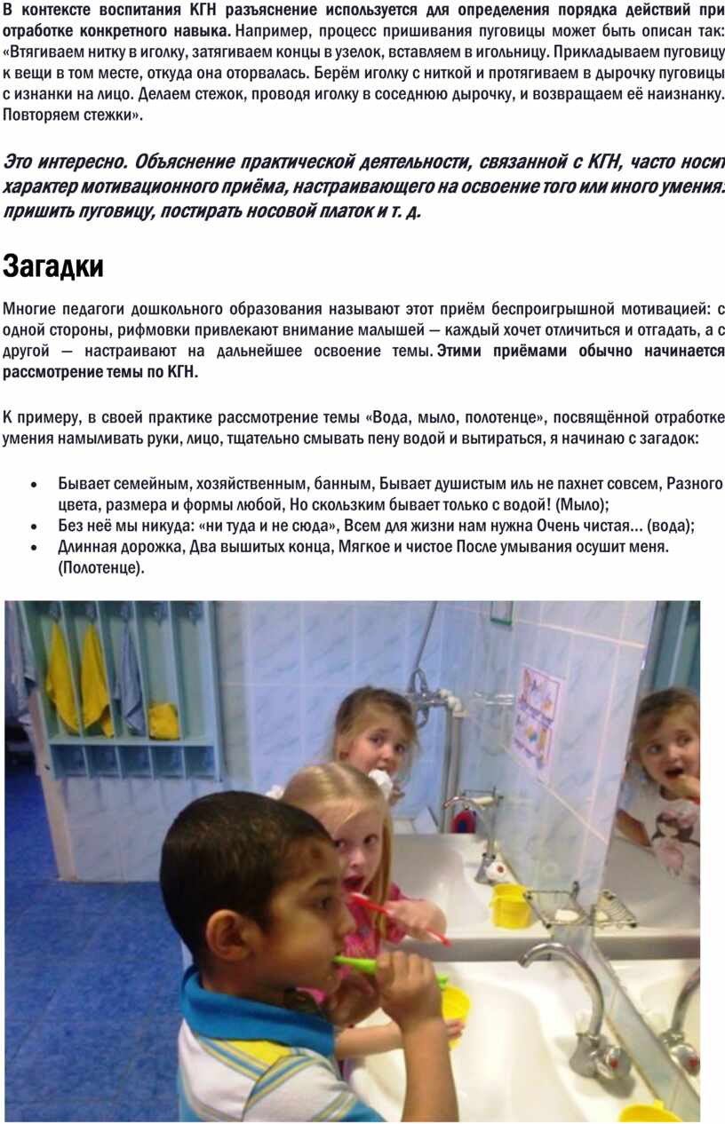 Это интересно. Объяснение практической деятельности, связанной с КГН, часто носит характер мотивационного приёма, настраивающего на освоение того или иного умения: пришить пуговицу, постирать носовой платок и т. д.