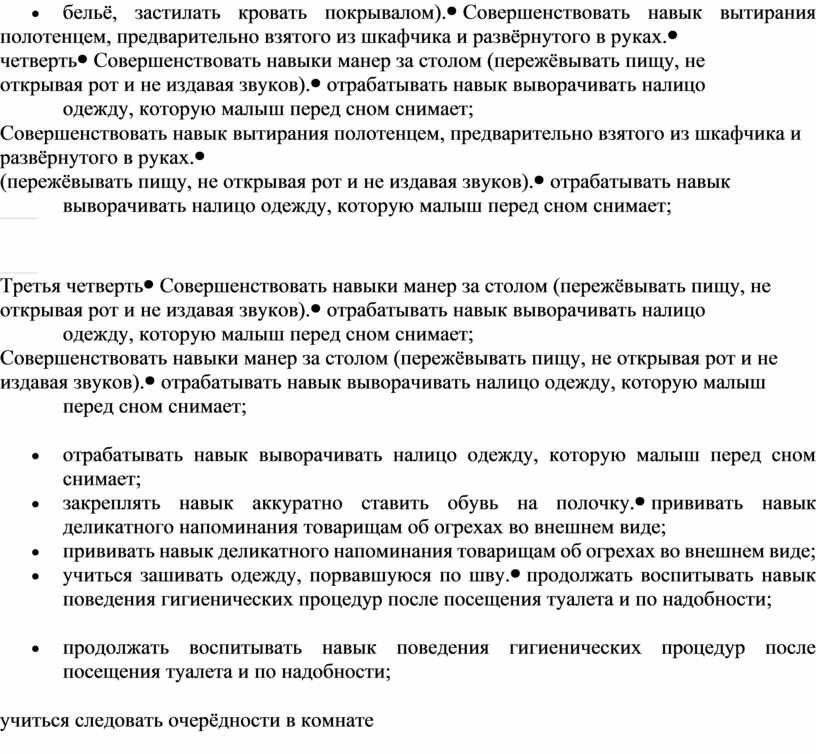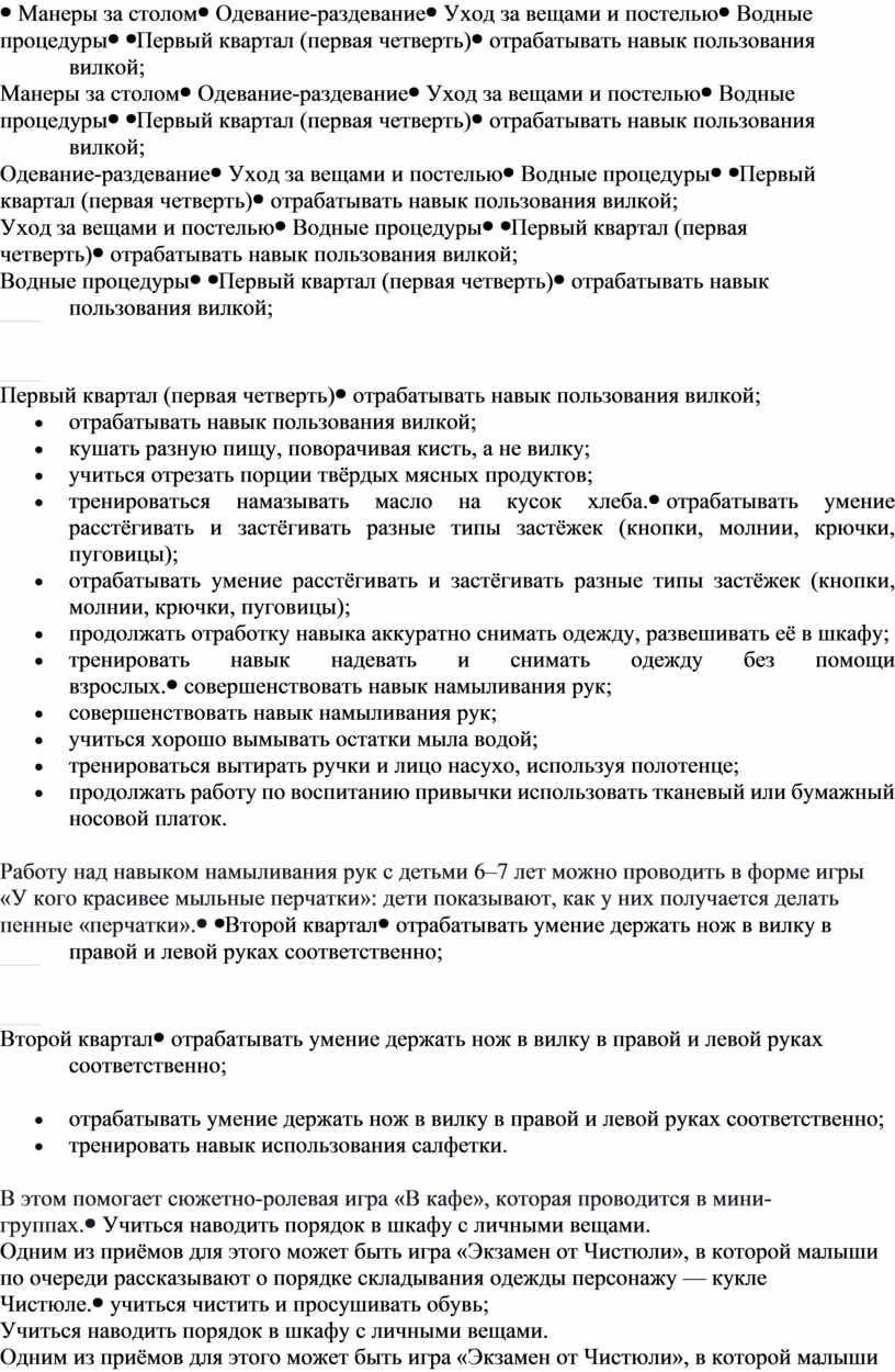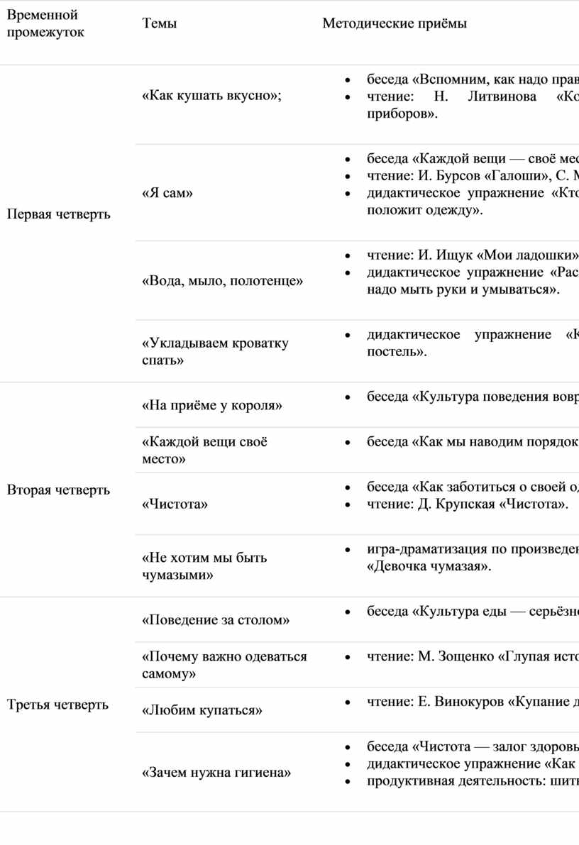 Поскольку воспитание КГН — процесс непрерывный, то очень важно правильно дозировать отработку каждого навыка, например, поквартально (по четвертям). И рационализировать эту деятельность помогает распределение умений по четырём областям самообслуживания: