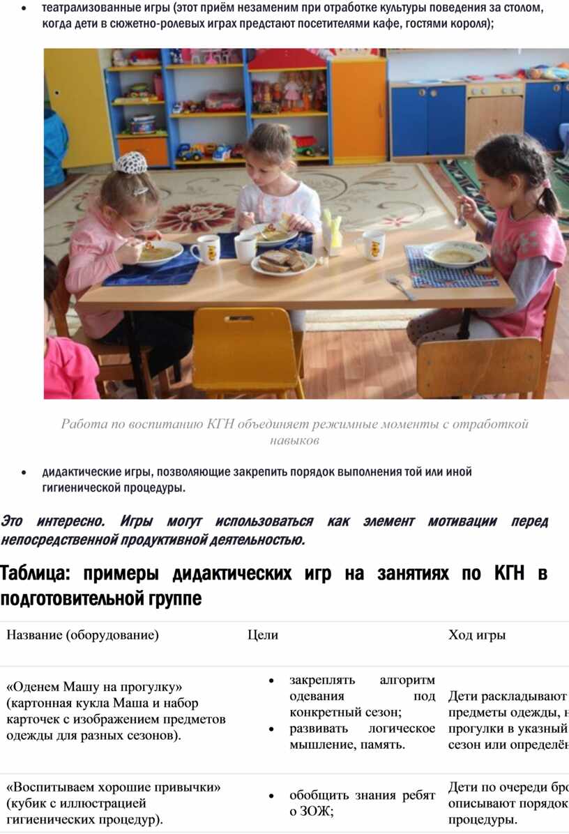 Работа по воспитанию КГН объединяет режимные моменты с отработкой навыков