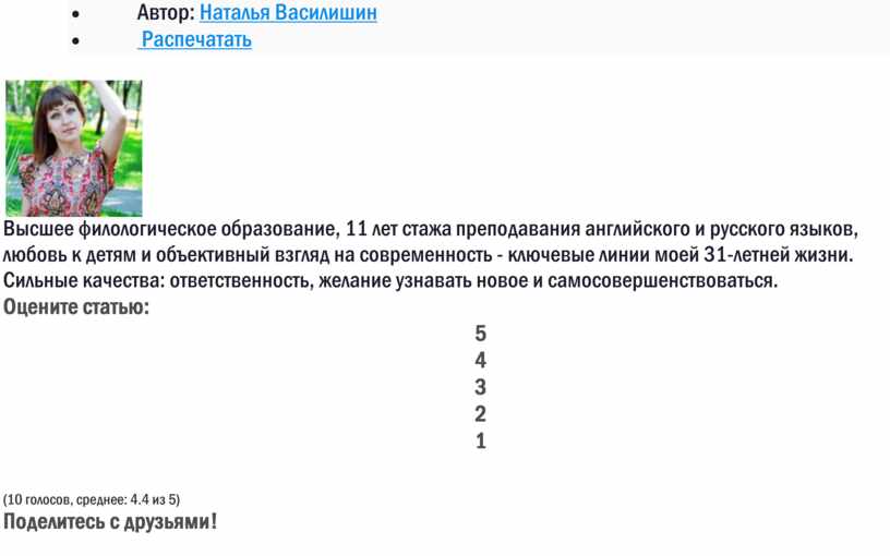 Высшее филологическое образование, 11 лет стажа преподавания английского и русского языков, любовь к детям и объективный взгляд на современность - ключевые линии моей 31-летней жизни. Сильные качества: ответственность, желание узнавать новое и самосовершенствоваться.