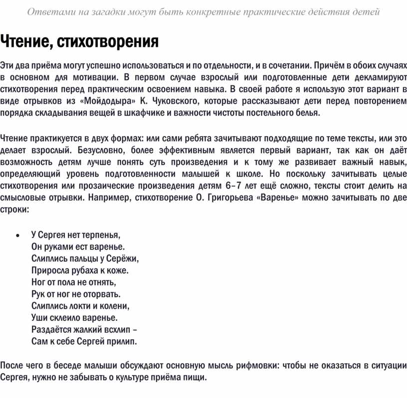 Эти два приёма могут успешно использоваться и по отдельности, и в сочетании. Причём в обоих случаях в основном для мотивации. В первом случае взрослый или подготовленные дети декламируют стихотворения перед практическим освоением навыка. В своей работе я использую этот вариант в виде отрывков из «Мойдодыра» К. Чуковского, которые рассказывают дети перед повторением порядка складывания вещей в шкафчике и важности чистоты постельного белья.