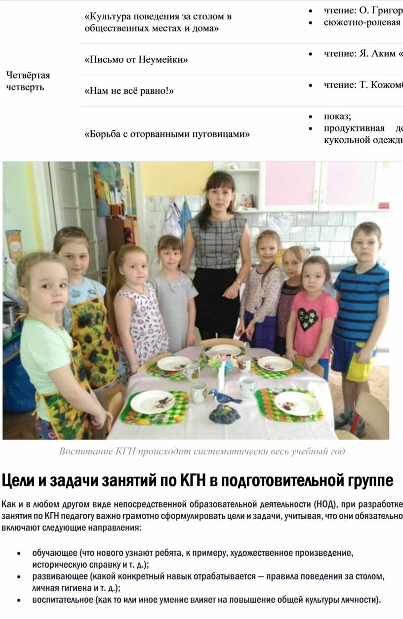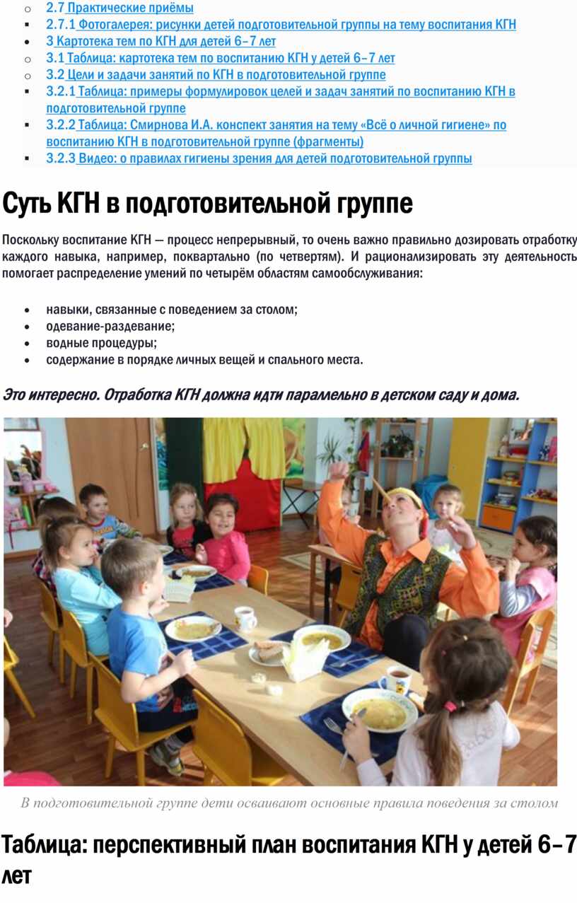 В подготовительной группе детского сада воспитание КГН носит характер обобщения знаний и умений, полученных ранее. Дети отрабатывают навыки проведения гигиенических процедур, учатся ухаживать за своими вещами, содержать их в порядке, а также осваивают правила поведения за столом, в том числе и традиции пользования столовыми приборами. Все эти составные элементы воспитания культуры здоровья должны включаться педагогом в составление плана и конспектов занятий по КГН.