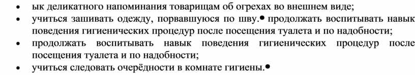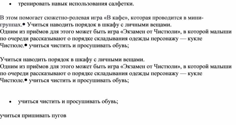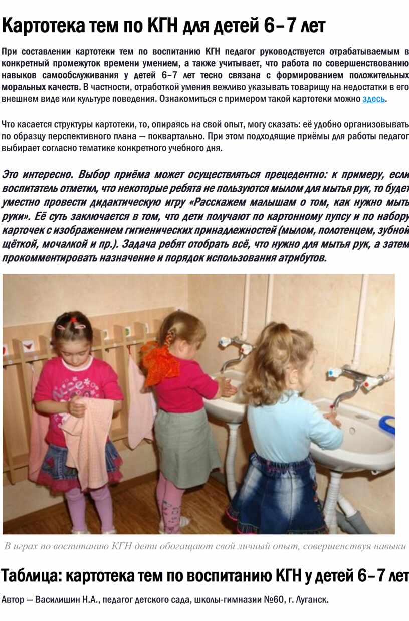 При составлении картотеки тем по воспитанию КГН педагог руководствуется отрабатываемым в конкретный промежуток времени умением, а также учитывает, что работа по совершенствованию навыков самообслуживания у детей 6–7 лет тесно связана с формированием положительных моральных качеств. В частности, отработкой умения вежливо указывать товарищу на недостатки в его внешнем виде или культуре поведения. Ознакомиться с примером такой картотеки можно здесь.