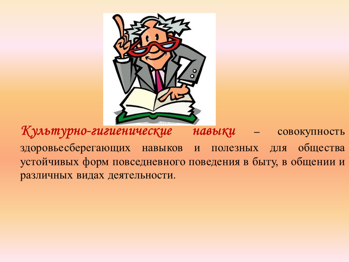 Культурно-гигиенические навыки – совокупность здоровьесберегающих навыков и полезных для общества устойчивых форм повседневного поведения в быту, в общении и различных видах деятельности.
