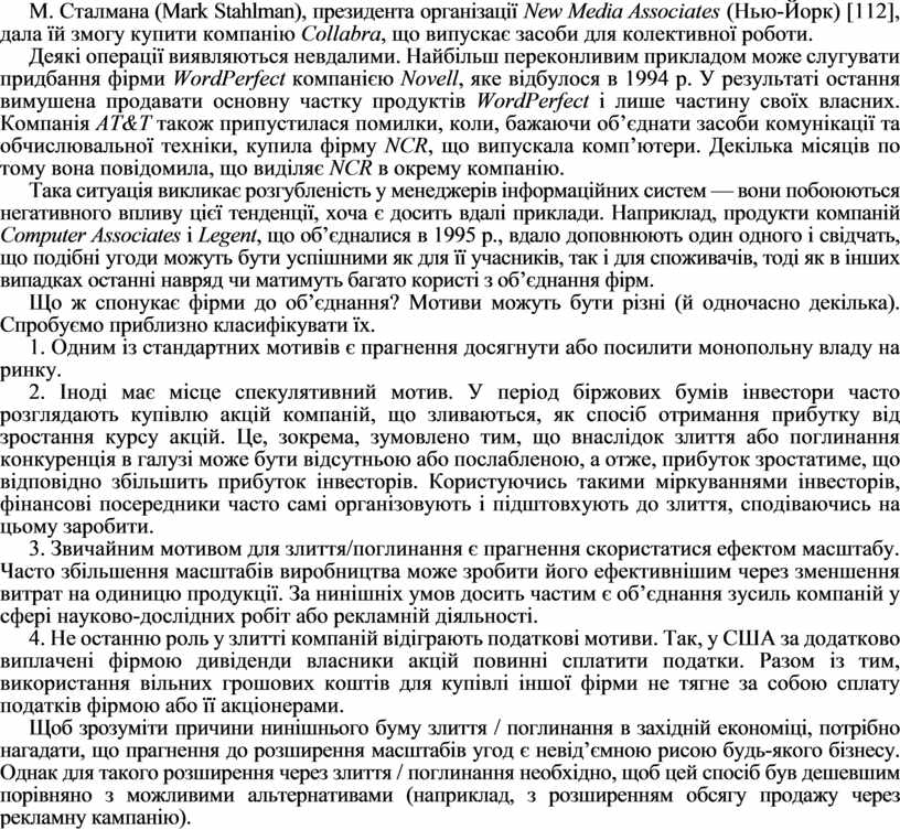 Зацікавленість компаній у злитті підтримує також невиправдано високий курс акцій деяких підприємств, що працюють у сфері високих інформаційних технологій. Чим вища вартість акцій фірми, тим більше у неї капіталу для укладання угод купівлі-продажу. Прикладом може слугувати фірма Wall-street Netscape Communications, завищена вартість акцій якої, на думку М. Сталмана (Mark Stahlman), президента організації New Media Associates (Нью-Йорк) [112], дала їй змогу купити компанію Cоllabra, що випускає засоби для колективної роботи.