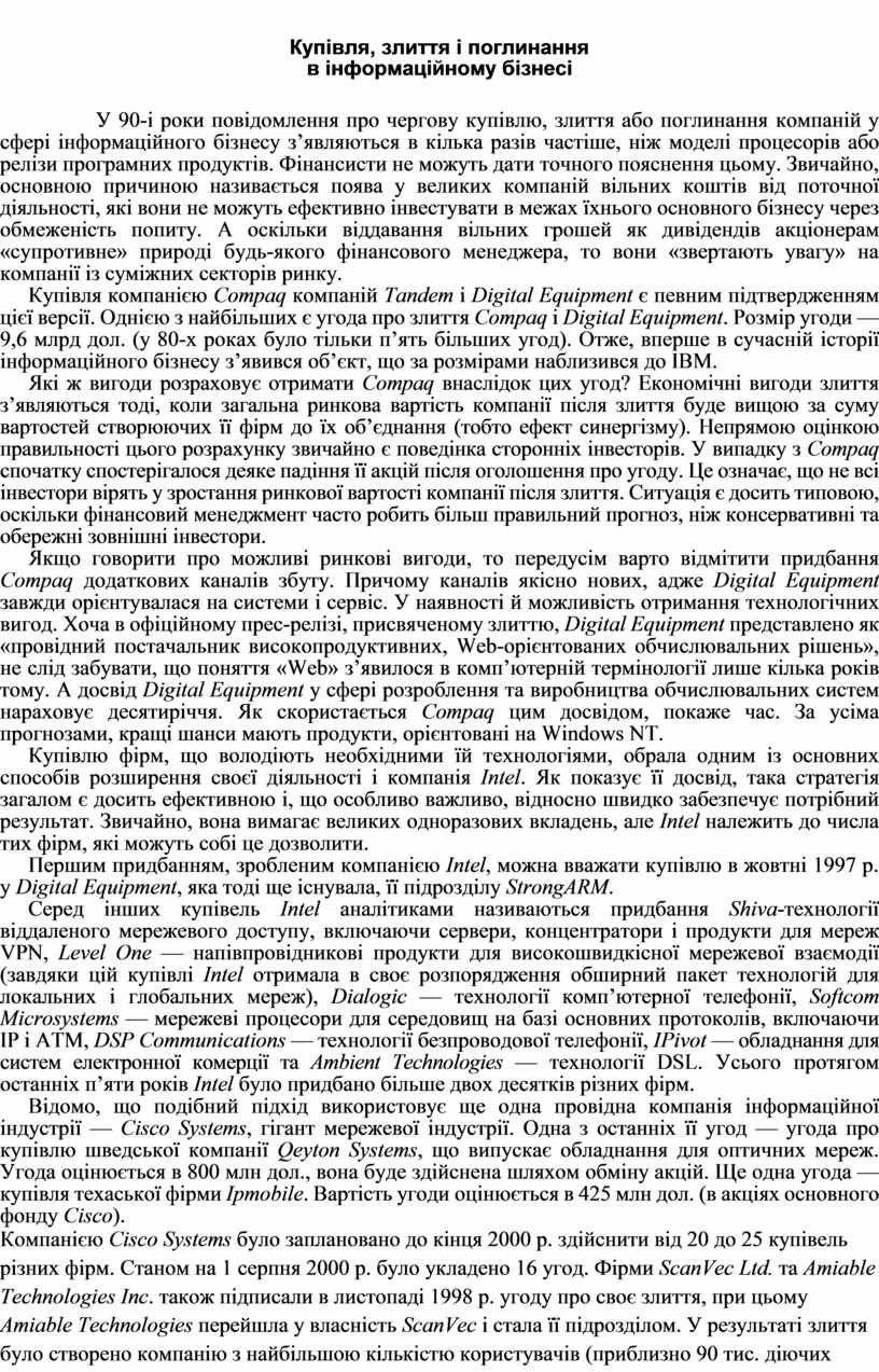Купівля компанією Compaq компаній Tandem і Digital Equipment є певним підтвердженням цієї версії. Однією з найбільших є угода про злиття Compaq і Digital Equipment. Розмір угоди — 9,6 млрд дол. (у 80-х роках було тільки п’ять більших угод). Отже, вперше в сучасній історії інформаційного бізнесу з’явився об’єкт, що за розмірами наблизився до IВМ.
