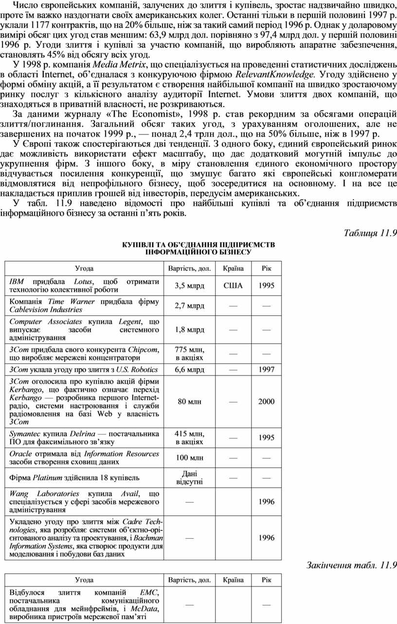 У табл. 11.9 наведено відомості про найбільші купівлі та об’єднання підприємств інформаційного бізнесу за останні п’ять років.