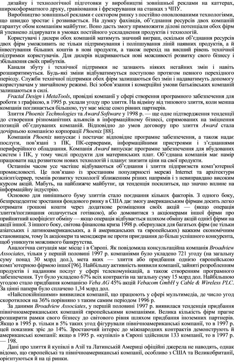 Аналогічна ситуація має місце і в Європі. Як повідомила консультаційна компанія Broadview Associates, тільки у першій половині 1997 р. компаніями було укладено 721 угоду (на загальну суму понад 30 млрд дол.), мета яких — злиття або придбання однією європейською комп’ютерною фірмою іншої [96]. Найбільшу активність виявили компанії, зайняті розробленням продуктів і наданням послуг у сфері телекомунікацій, а також створенням програмного забезпечення. Тут було укладено 67% всіх контрактів на загальну суму 15 млрд дол. Найбільшою угодою стало придбання компанією Veba AG 45% акцій Vebacom GmbH у Cable & Wireless PLC. За цінні папери було сплачено 1,34 млрд дол.