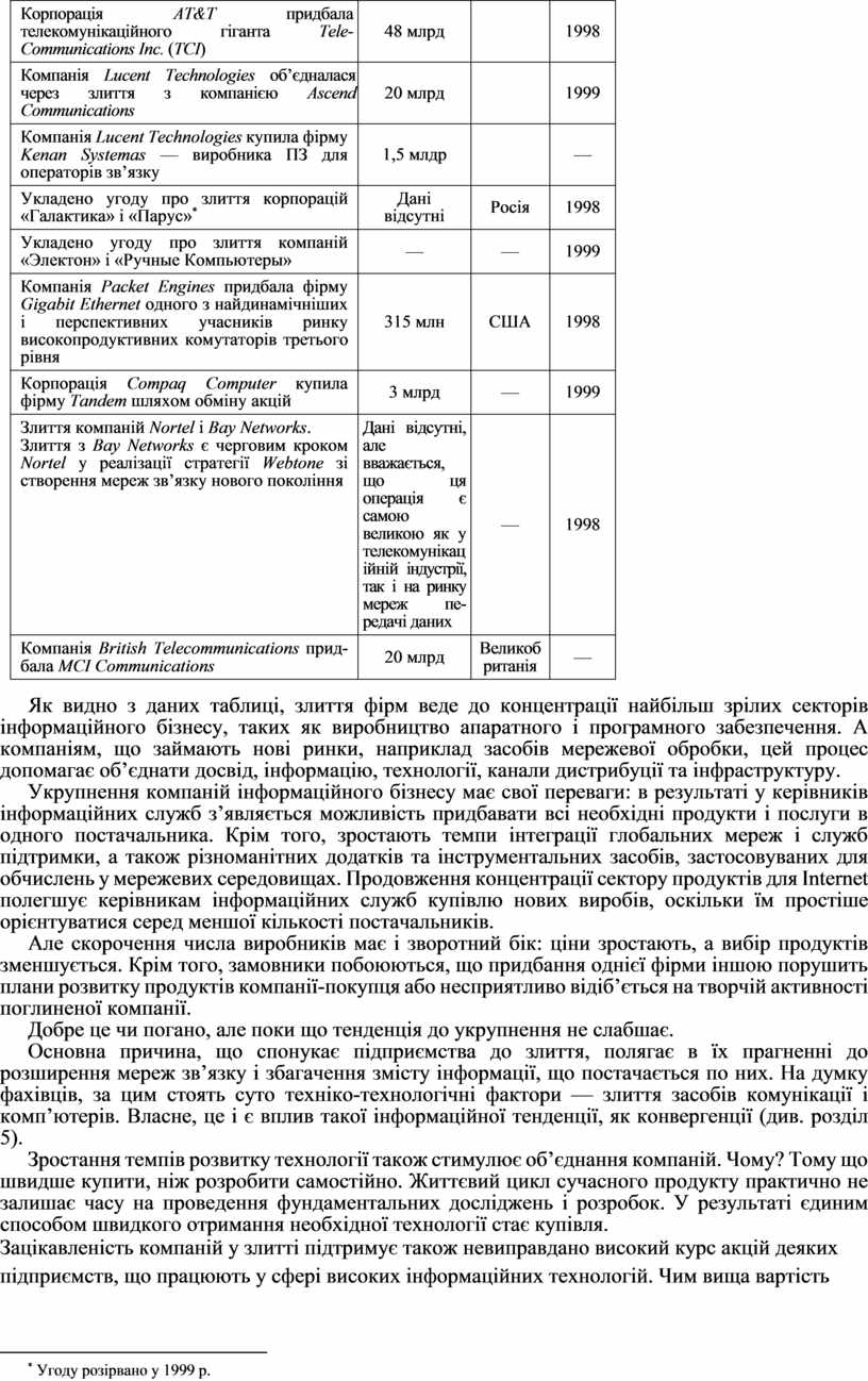 Як видно з даних таблиці, злиття фірм веде до концентрації найбільш зрілих секторів інформаційного бізнесу, таких як виробництво апаратного і програмного забезпечення. А компаніям, що займають нові ринки, наприклад засобів мережевої обробки, цей процес допомагає об’єднати досвід, інформацію, технології, канали дистрибуції та інфраструктуру.