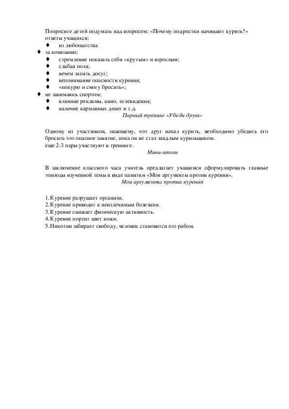 эпизоды изученной темы в виде памятки «Мои аргументы против курения».