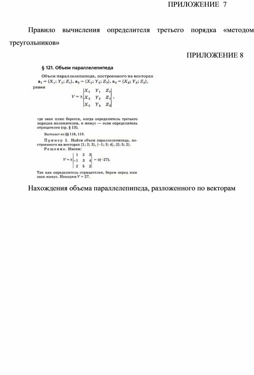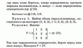 Где знак плюс берется, если определитель третьего порядка положителен. И минус – если определитель отрицателен. Пример вычисления объема параллелепипеда, построенного на векторах, приведен[3]. (Приложение8)