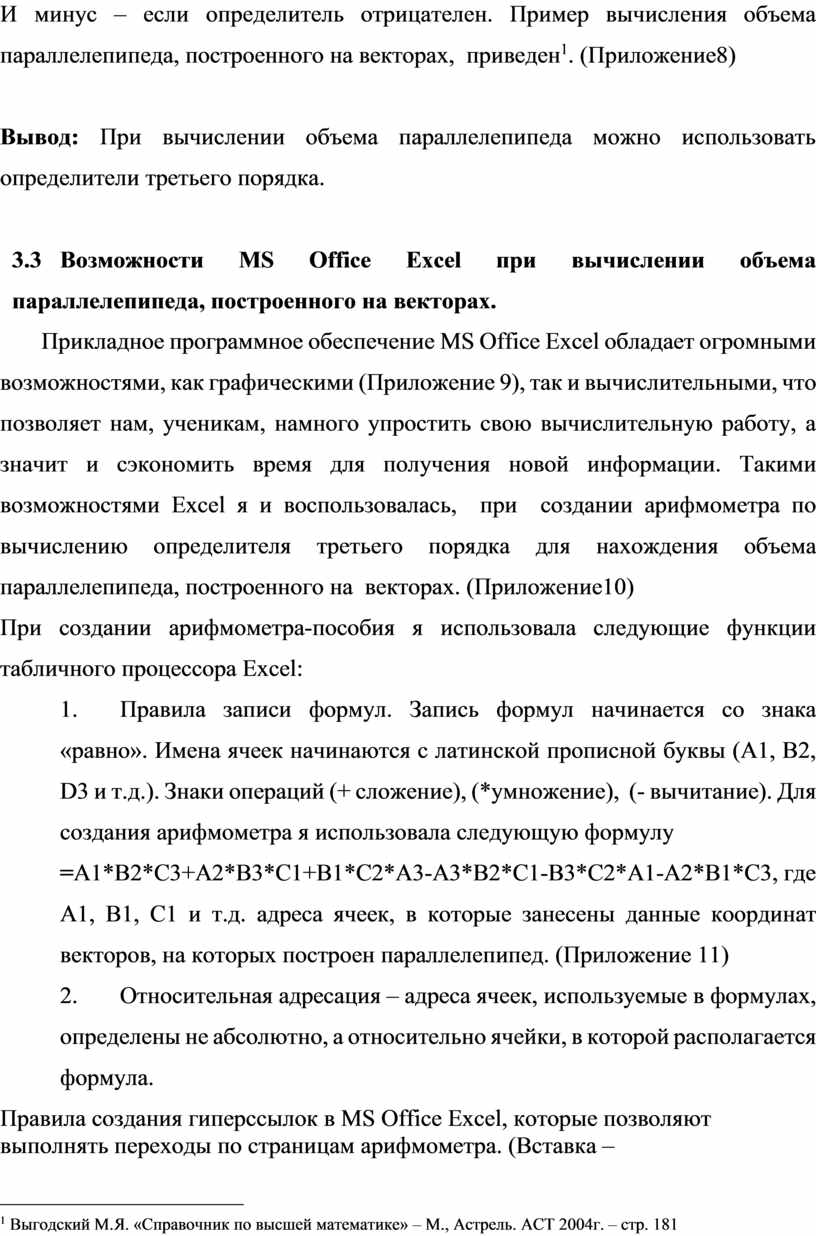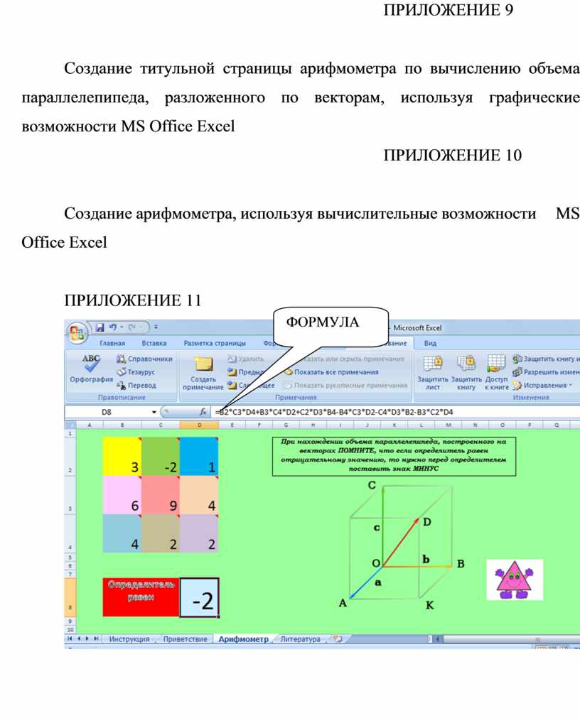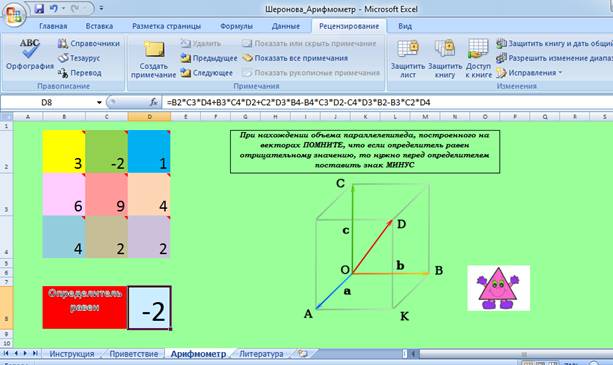 Прикладное программное обеспечение MS Office Excel обладает огромными возможностями, как графическими (Приложение 9), так и вычислительными, что позволяет нам, ученикам, намного упростить свою вычислительную работу, а значит и сэкономить время для получения новой информации. Такими возможностями Excel я и воспользовалась, при создании арифмометра по вычислению определителя третьего порядка для нахождения объема параллелепипеда, построенного на векторах. (Приложение10)