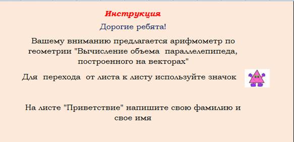 Создание титульной страницы арифмометра по вычислению объема параллелепипеда, разложенного по векторам, используя графические возможности MS Office Excel