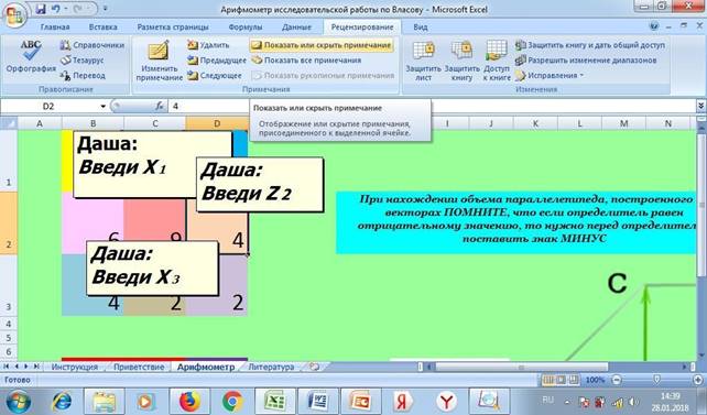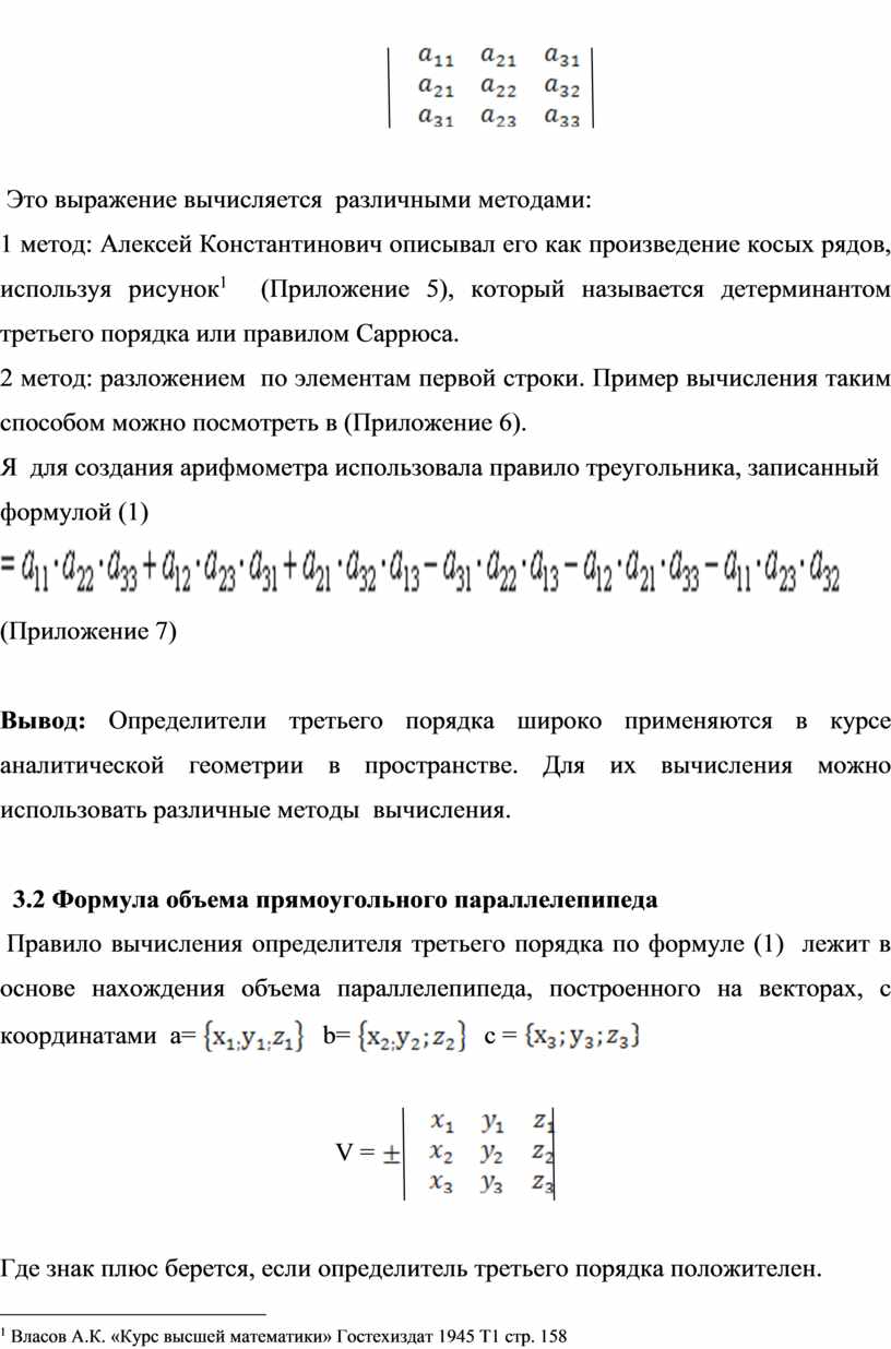 Гипотеза: при условии, что компьютеры и ИКТ вошли в нашу жизнь на постоянной основе, возможно ли применить ППО MS Office Excel в нахождении объема параллелепипеда, построенного на векторах, используя метод определителя (детерминанта) третьего порядка, встречающийся в курсе лекций А.К. Власова и создать арифмометр для нахождения объема данной фигуры.