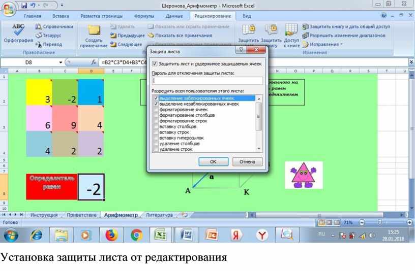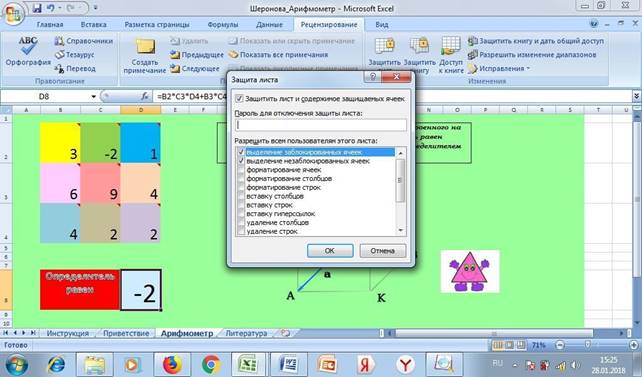 5. Для защиты от редактирования в арифмометре была использована функция «Защитить лист». Для этого на вкладке Рецензирование – Защитить лист нужно ввести Ваш код. (Приложение 14)