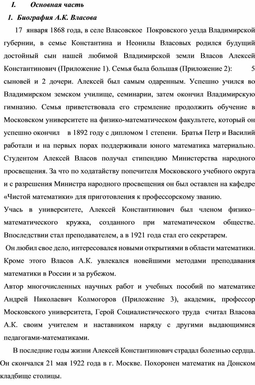 17 января 1868 года, в селе Власовское Покровского уезда Владимирской губернии, в семье Константина и Неонилы Власовых родился будущий достойный сын нашей любимой Владимирской земли Власов Алексей Константинович (Приложение 1). Семья была большая (Приложение 2): 5 сыновей и 2 дочери. Алексей был самым одаренным. Успешно учился во Владимирском земском училище, семинарии, затем окончил Владимирскую гимназию. Семья приветствовала его стремление продолжить обучение в Московском университете на физико-математическом факультете, который он успешно окончил в 1892 году с дипломом 1 степени. Братья Петр и Василий работали и на первых порах поддерживали юного математика материально. Студентом Алексей Власов получал стипендию Министерства народного просвещения. За что по ходатайству попечителя Московского учебного округа и с разрешения Министра народного просвещения он был оставлен на кафедре «Чистой математики» для приготовления к профессорскому званию.