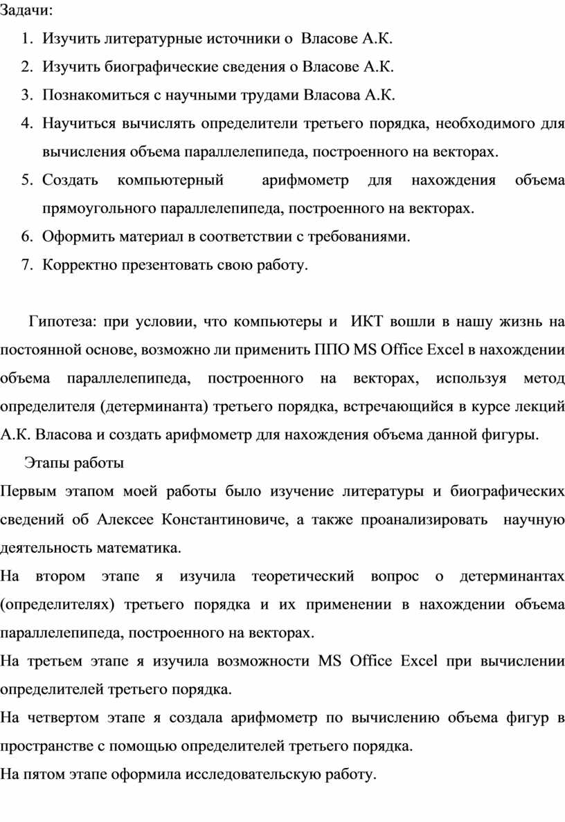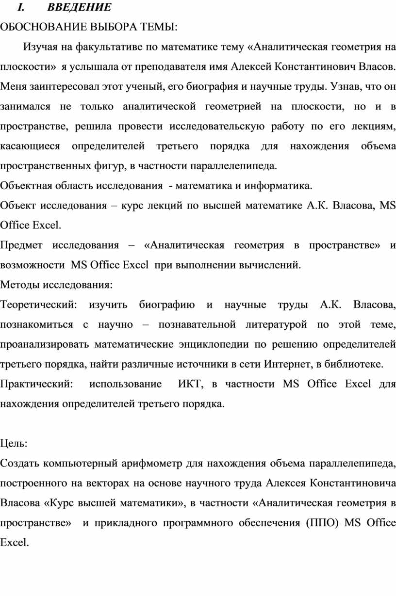Изучая на факультативе по математике тему «Аналитическая геометрия на плоскости» я услышала от преподавателя имя Алексей Константинович Власов. Меня заинтересовал этот ученый, его биография и научные труды. Узнав, что он занимался не только аналитической геометрией на плоскости, но и в пространстве, решила провести исследовательскую работу по его лекциям, касающиеся определителей третьего порядка для нахождения объема пространственных фигур, в частности параллелепипеда.