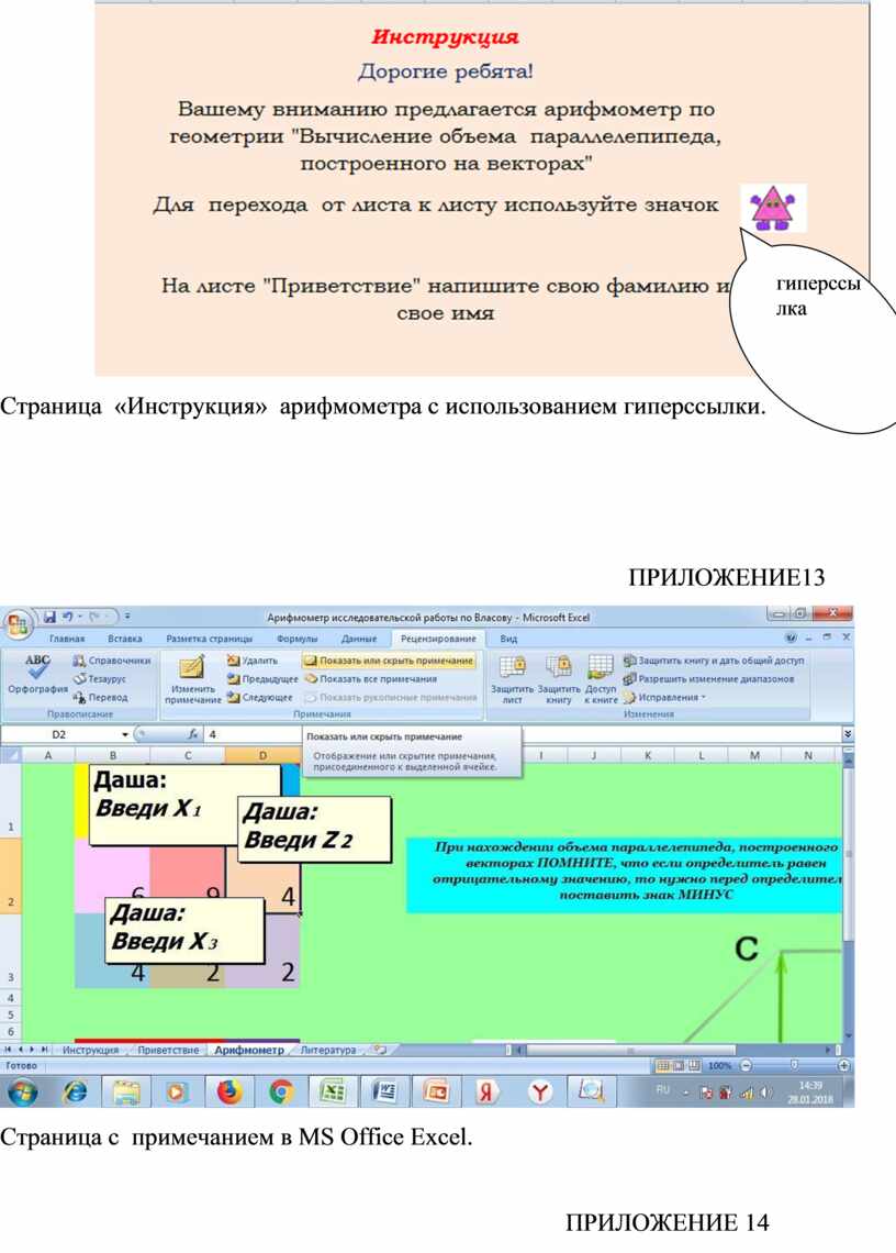 3. Правила создания гиперссылок в MS Office Excel, которые позволяют выполнять переходы по страницам арифмометра. (Вставка – Гиперссылка – местом в документе –инструкция и т.д.) (Приложение 12)