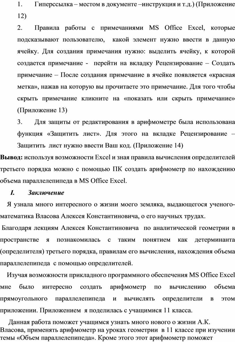 Создать компьютерный арифмометр для нахождения объема параллелепипеда, построенного на векторах на основе научного труда Алексея Константиновича Власова «Курс высшей математики», в частности «Аналитическая геометрия в пространстве» и прикладного программного обеспечения (ППО) MS Office Excel.