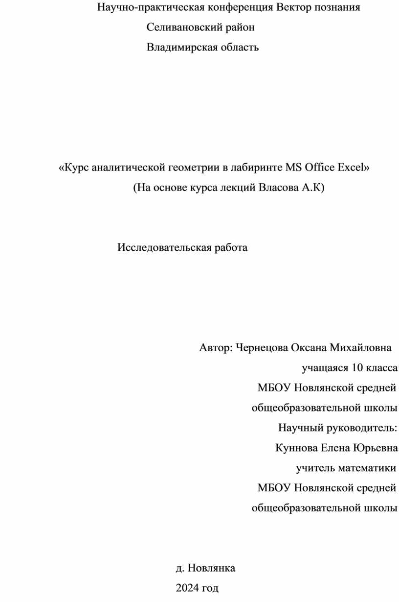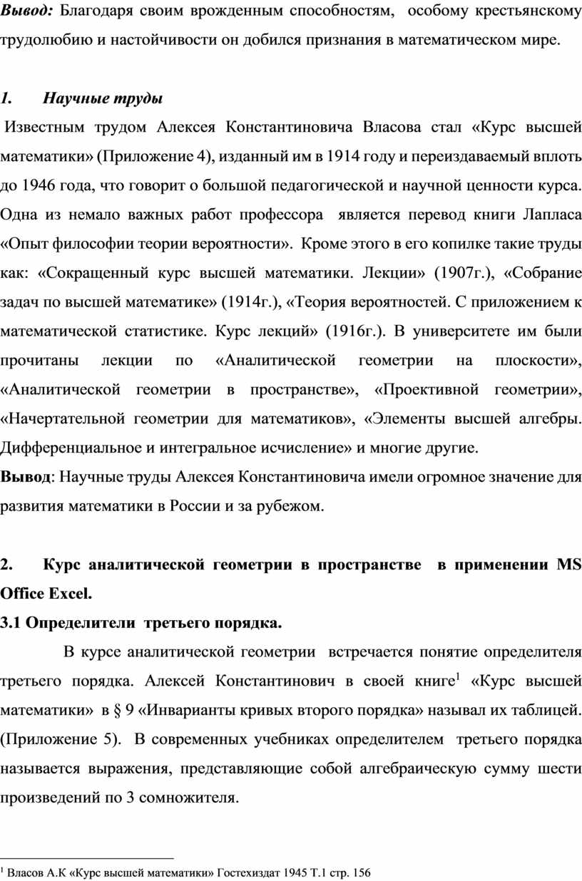 Объект исследования – курс лекций по высшей математике А.К. Власова, MS Office Excel.
