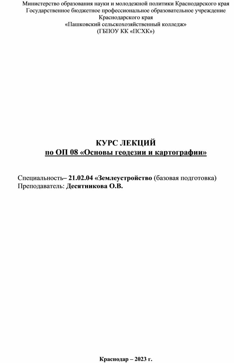 Данный курс лекций рекомендован как для самостоятельного изучения, так и на уроках учебной общепрофессиональной дисциплины «Основы геодезии и картографии» студентами специальности 21.02.04 «Землеустройство» базового уровня подготовки очной формы обучения.