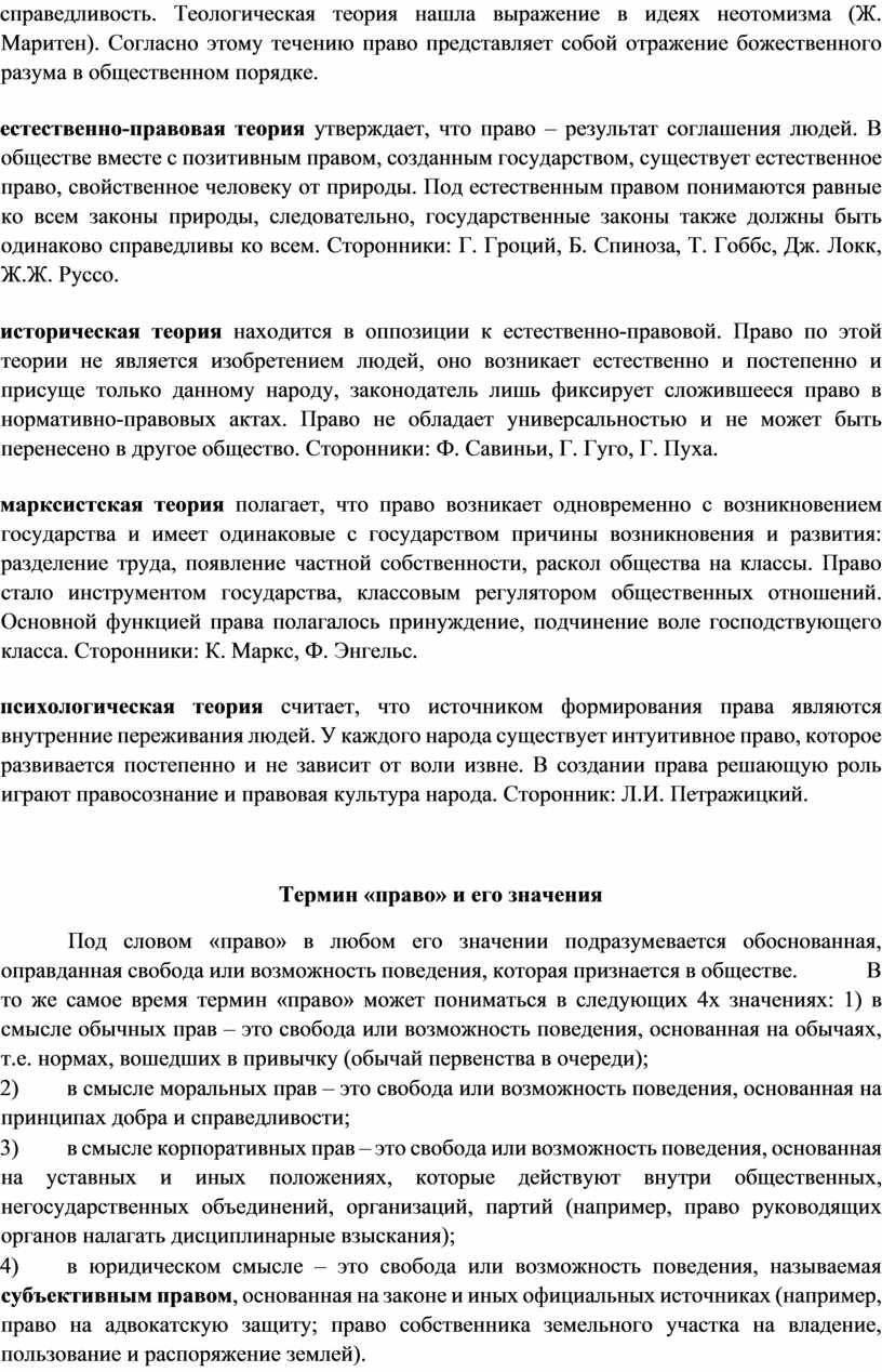 теологическая теория – одна из самых древних. Полагается, что правовые нормы исходят от Бога. Понятие права связывалось со справедливостью, правосудием. Главным фактором, поддерживающим общественный порядок, было наказание. Фома Аквинский различал право и закон, определяя закон как установление разума, а право – как высшую справедливость. Теологическая теория нашла выражение в идеях неотомизма (Ж. Маритен). Согласно этому течению право представляет собой отражение божественного разума в общественном порядке.