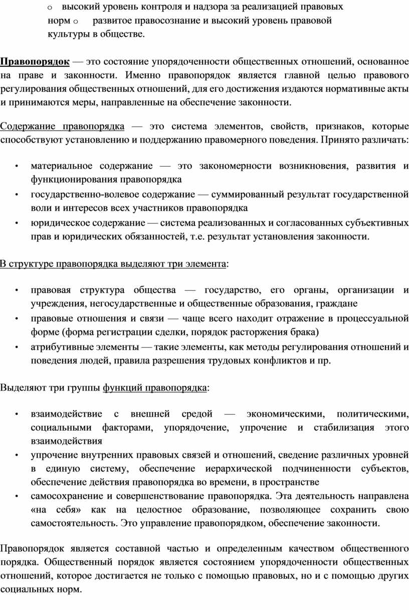 Содержание правопорядка — это система элементов, свойств, признаков, которые способствуют установлению и поддержанию правомерного поведения. Принято различать: