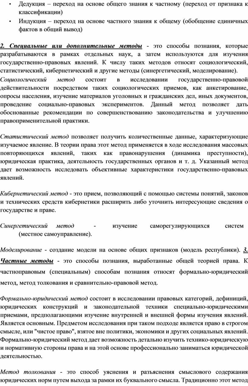 2. Специальные или дополнительные методы - это способы познания, которые разрабатываются в рамках отдельных наук, а затем используются для изучения государственно-правовых явлений. К числу таких методов относят социологический, статистический, кибернетический и другие методы (синергетический, моделирование).